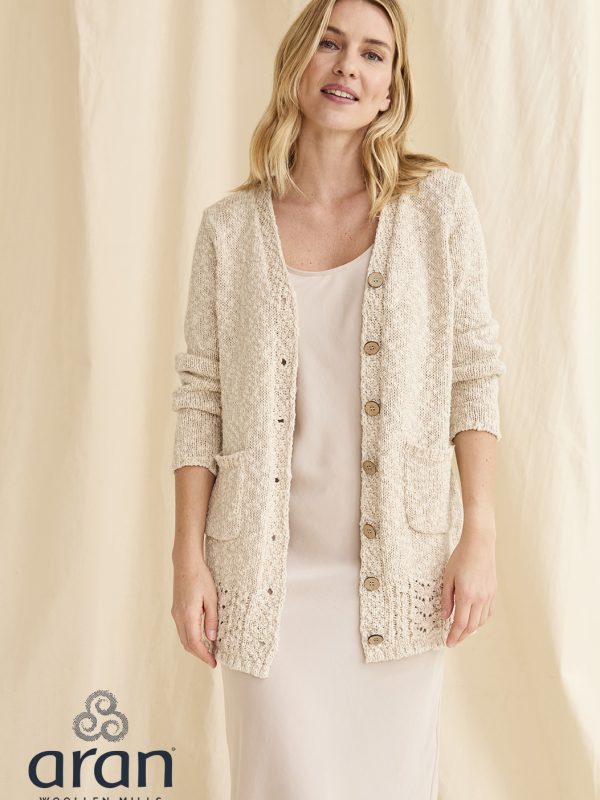 Asymmetrische Strickjacke mit Zopfmustern und drei Knöpfen
