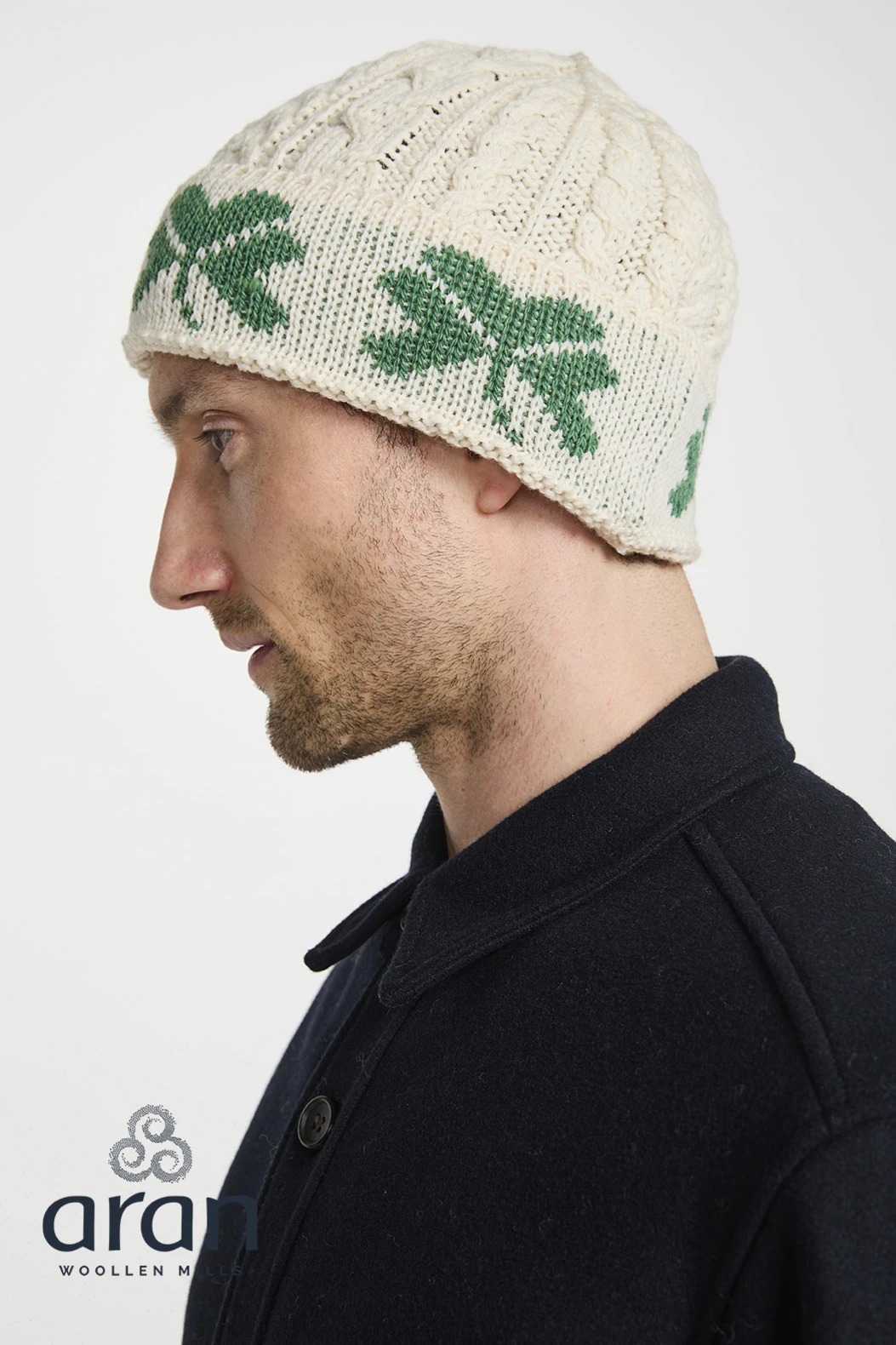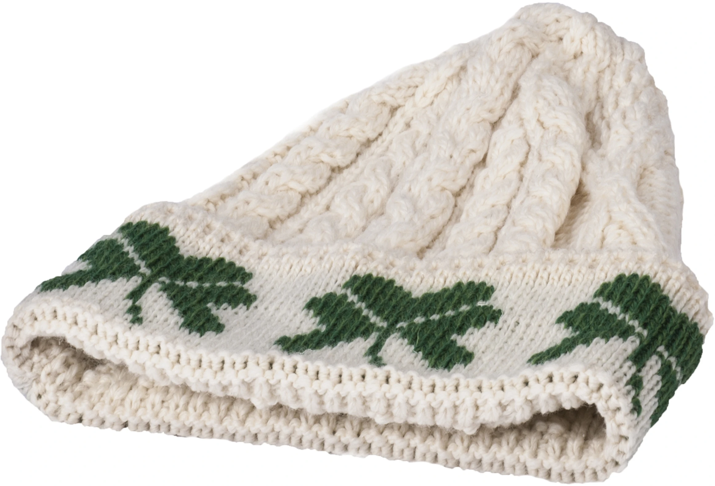 With mirrored cables and diamond stitch with moss stitch infill, this fun hat features shamrocks on the turn up.