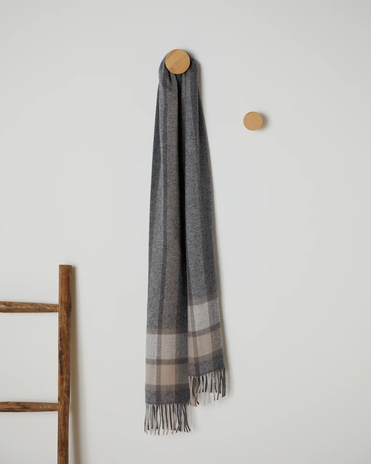 Dieser wärmende Schal wird aus 100%-Lammwollgarn in Grau, Nerzfarbe und Naturweiss gewebt – unter Verwendung einer traditionellen Fischgrättechnik.