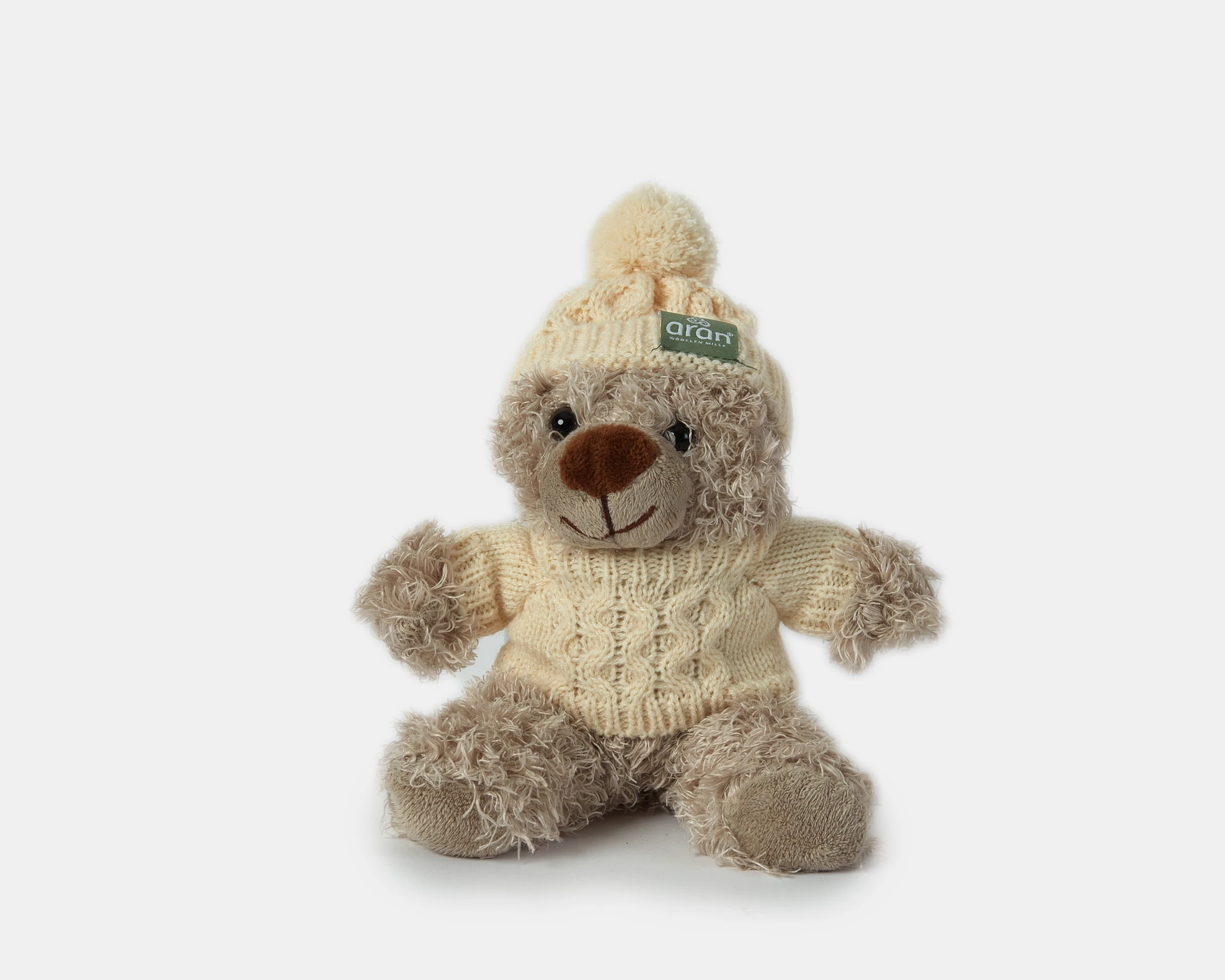 Plüschteddybär mit CE-Kennzeichnung. Traditioneller Aran-Pullover mit Zopfmuster und Bommelmütze, die ausgezogen werden können. Ein tolles Geschenk für jedes Alter oder ein niedliches Souvenir.